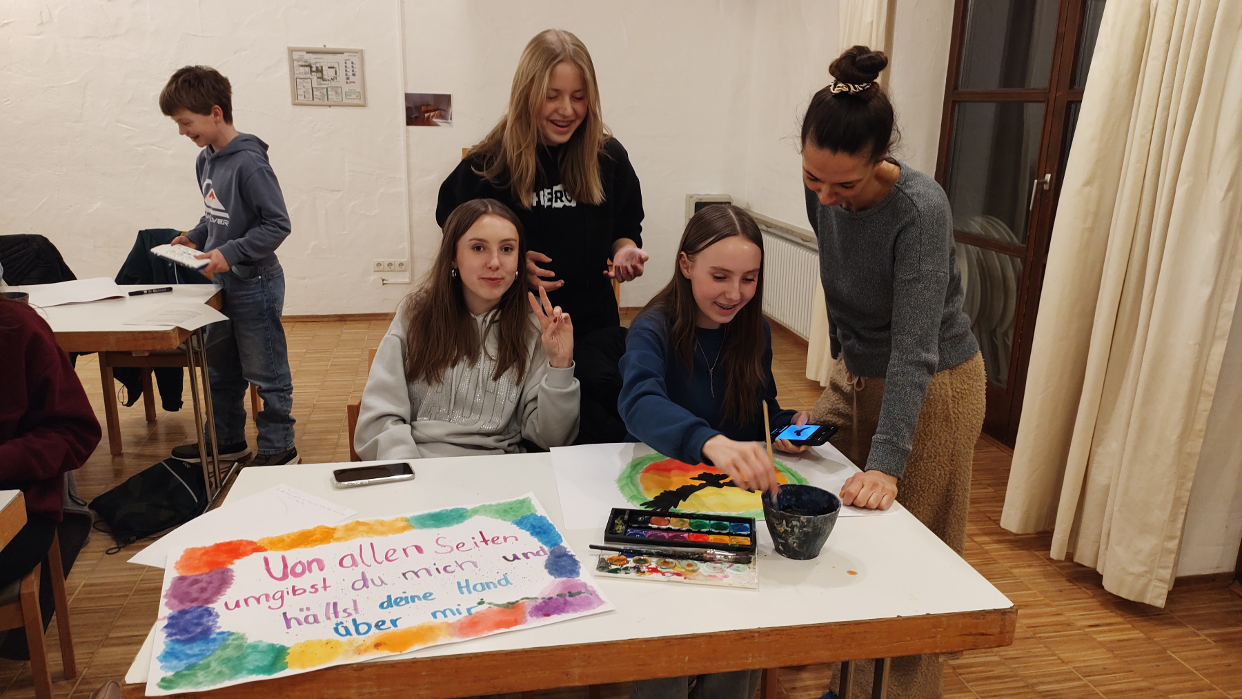 Kunstlehrerin-Jasmin-Strickroth-coacht-Konfis-beim-Malen-der-Konfi-Sprueche